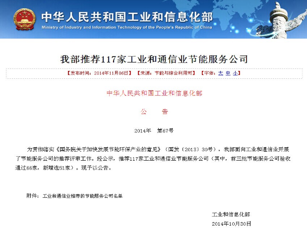2014年11月4日,國(guó)家工業(yè)和信息化部發(fā)布了關(guān)于全國(guó)117工業(yè)和通信業(yè)節(jié)能服務(wù)公司推薦名單的公告,我公司憑借在節(jié)能服務(wù)領(lǐng)域的良好業(yè)績(jī),成功入選。這標(biāo)志著公司的技術(shù)服務(wù)能力得到權(quán)威部門(mén)及業(yè)界的認(rèn)可為公司的進(jìn)一步發(fā)展奠定了良好的基礎(chǔ)。